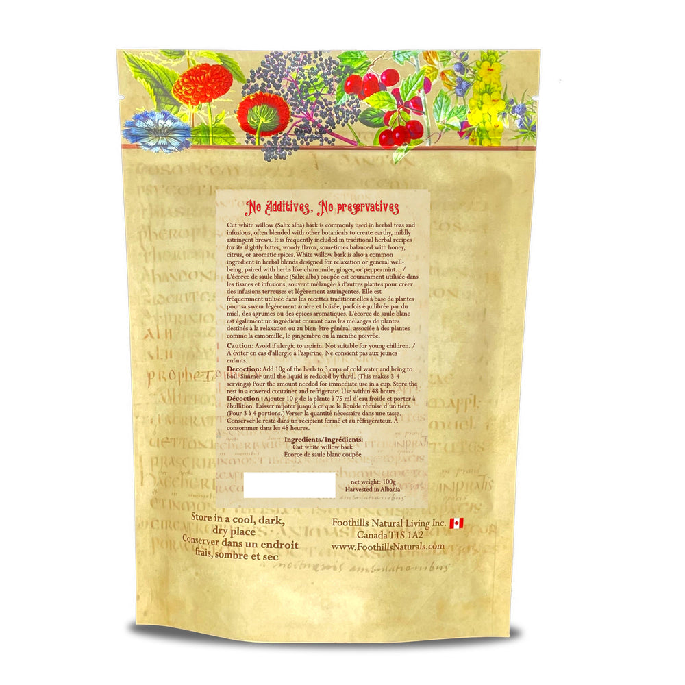• Cut white willow (Salix alba) bark is commonly used in herbal teas and infusions, often blended with other botanicals to create earthy, mildly astringent brews. It is frequently included in traditional herbal recipes for its slightly bitter, woody flavor, sometimes balanced with honey, citrus, or aromatic spices.