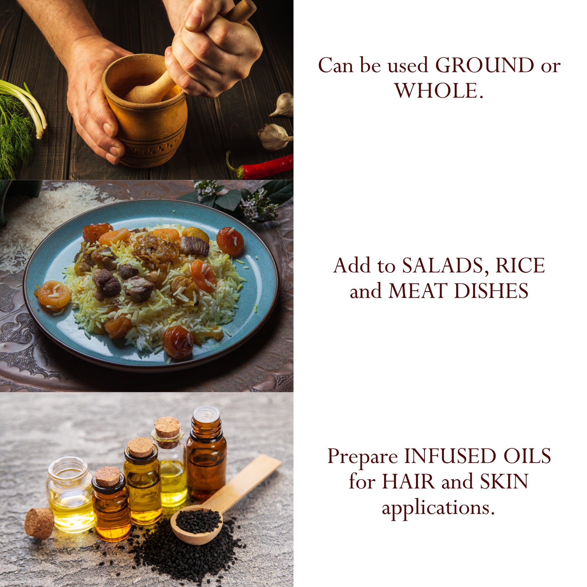 - Use to SPICE dishes, prepare BLACK CUMIN OIL, HERBAL BLENDS and COSMETICS
