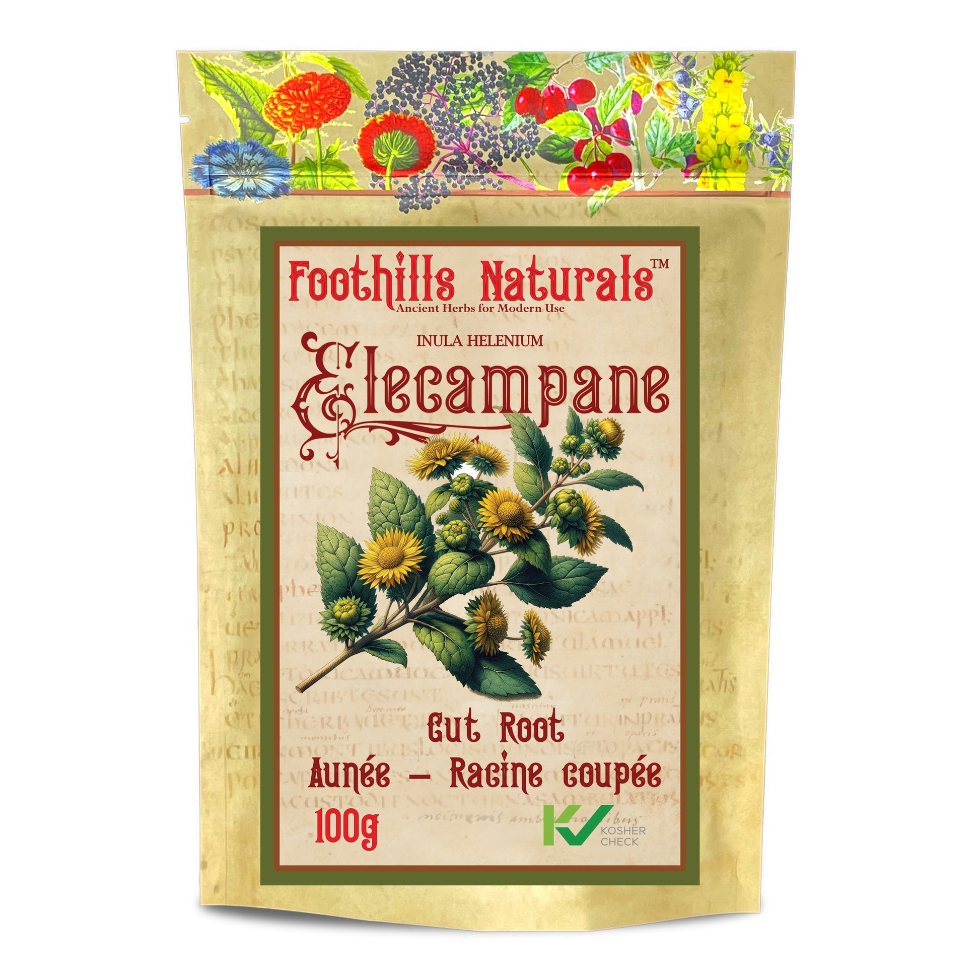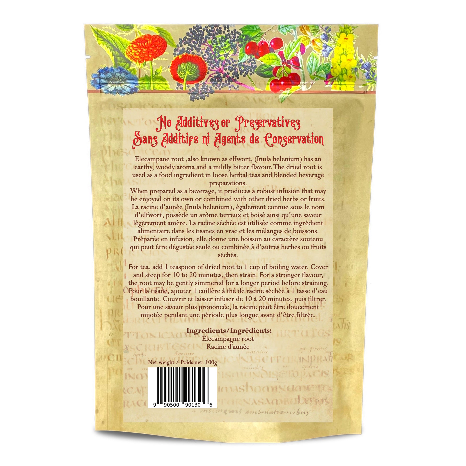 - Cut elecampane root (Inula Helenium). Also known as Horse-heal, elf dock, scabwort, velvet dock.